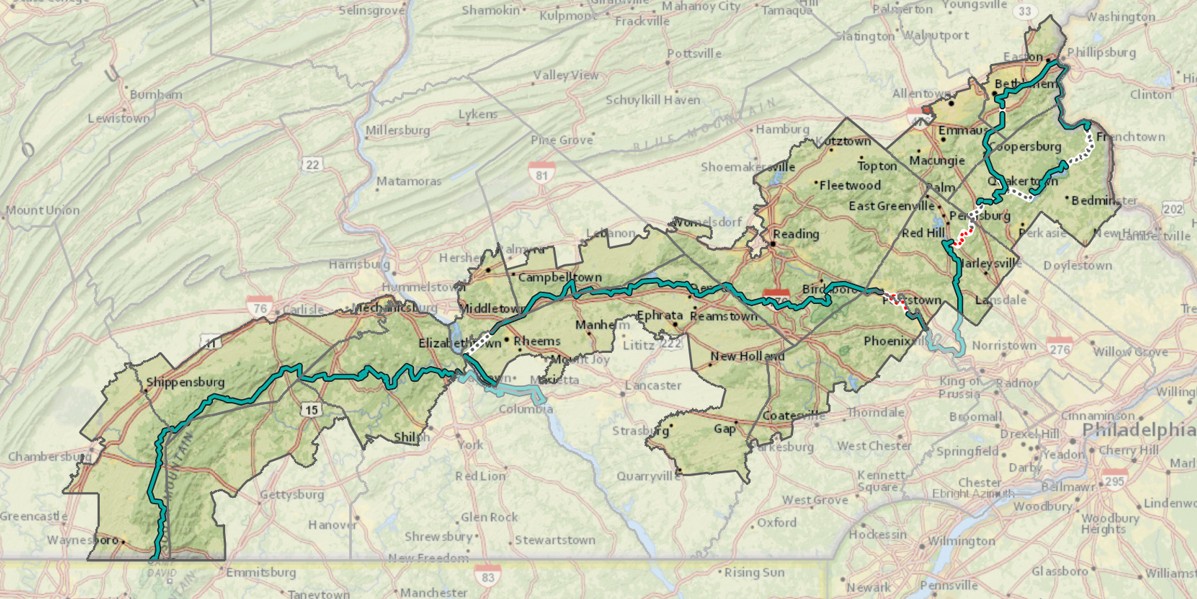 The Highlands Trail in Pennsylvania is a connected trail network located in the 1.9 million-acre, 13 county Pennsylvania Highlands region. The 300-mile route spans across southeast Pennsylvania, from the Pennsylvania-Maryland border in Waynesboro to the Delaware River in Easton. The trail co-aligns with several other trails in the region, including rugged, natural surface trails, as well as paved multi-use pathways. Hikers may find themselves walking through dense forests with beautiful vistas, or through urban areas where shops and restaurants are just steps away. Find more information about the PA Highlands Trail on our website, and check out our interactive map for more details on trail segments.